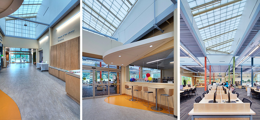 The design for The Louise Watley Library at Southeast Atlanta is centered around an open-plan concept which seeks to incorporate the essential public and separable functions such as Meeting Room, Conference Room, Café, and vending outside the Lobby. All other functions are placed in a rectilinear high-bay space. The plan is organized along a main north-south axis which intersects an east-west axis at the circulation desk. The Children’s Library is located on the west side of the main axis and is adjacent to the Staff Area along the west façade. The Adult Area is located on the east side of the main axis, while the Teen Area is in a separate glass-enclosed space near the entrance. The two axes are accentuated by a sky light system that reduces energy and provides glare-free light. LEED Gold Rating.